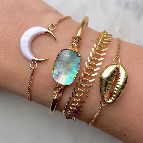LS-A875素晴らしいファッションナチュラルコワイヤーシェルブレスレットセットアワビシェルゴールドメッキムーンブレスレットワイヤーラップバングルセット